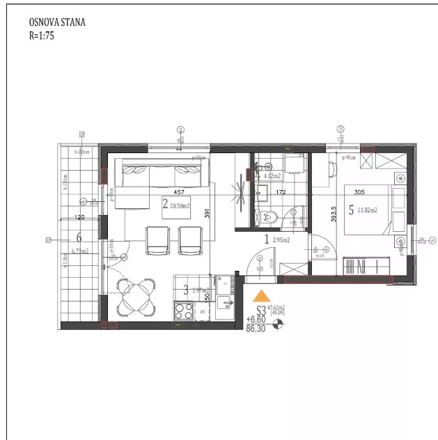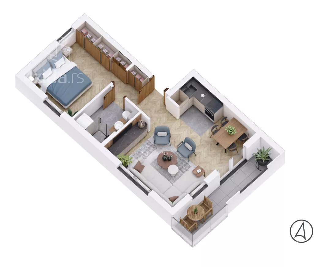 Stan se sastoji od: prostrane dnevne sobe sa kuhinjom, spavaće sobe, kupatila, terase i hodnika.