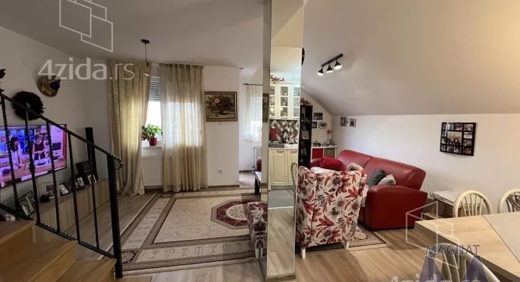 Novi Sad, Adice. NAMEŠTEN DUPLEX U NOVOJ ZGRADI SA PARKING MESTOM. Stan je površine 65m2, donja etaža je 41m2, a gornja 24m2. Stan je dvosoban, na prvoj etaži nalazi se prostran dnevni boravak sa trpezarijom i kuhinjom sa prirodnom ventilacijom; toalet, ostava i terasa. Na drugoj etaži nalazi se spavaća soba sa francuskim balkonom, i kupatilo sa prirodnom ventilacijom. Stan se prodaje sa nameštajem, uređen je sa ukusom i vrlo moderan. Grejanje je na gas sa kalorimetrima, stan ima svoj kotao (po utrošku). Zgrada je novije gradnje, na dve etaže, sa dva ulaza (svaki ulaz po 4 stana).