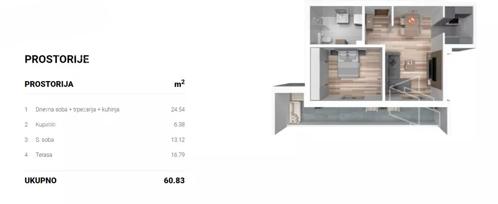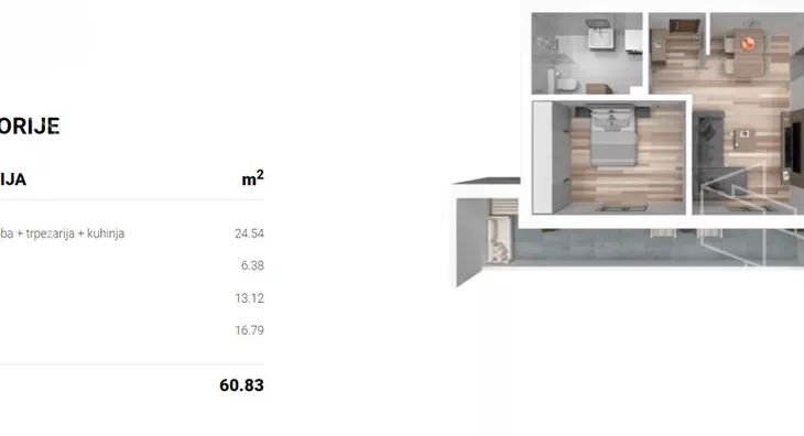 Stan u novogradnji površine 60,83m2 koji se sastoji od dnevnog boravka sa kuhinjom i trpezarijom, sobe,kupatila i lođe. Stan će imati podno grejanje koje se ističe niskim troškovima grejanja na prirodni gas, kvalitetnu PVC stolariju sa troslojnim niskoemisionim staklom i PVC roletnom. Zidovi su izgrađeni od termoblokova najviših izolacijskih svojstava + fasadna izolacija.Pregradni zidovi izgrađeni su od opeke. Na podovima će biti tarket podne obloge u sobama i trpezariji, a keramika I klase u kupatilima i kuhinji. U kupatilu tuš paravani od kaljenog stakla i linijski slivnici i ugradni vodokotlići. Stan će imati sigurnosna ulazna vrata,optički priključak,interfon iinstalacije za klimu. Završetak radova kraj 2025. godine.