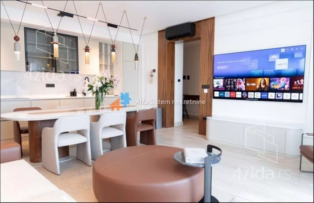 Stan površine 130 m2 je pažljivo osmišljen i kompletno urađen po meri, sa najkvalitetnijim materijalima i opremom renomiranih brendova. Svaki detalj odiše elegancijom i luksuzom - od Masiero rasvete, italijanske keramike, do kuhinjskih uređaja Bosch Series 8 i pametnih sistema za upravljanje osvetljenjem i klimatizacijom.