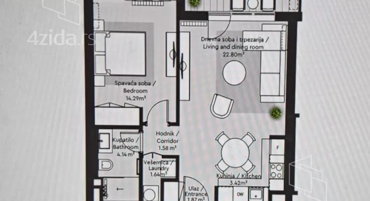 Hodnik, dnevni boravak, kuhinja i trpezarija, spavaca soba, kupatilo, vesernica,