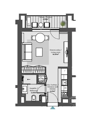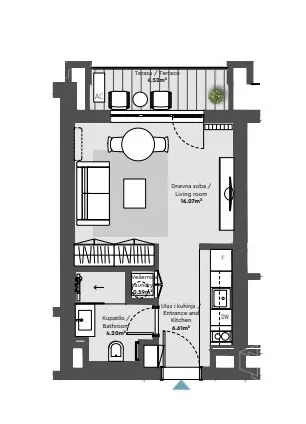 - Prostorije: kupatilo, terasa