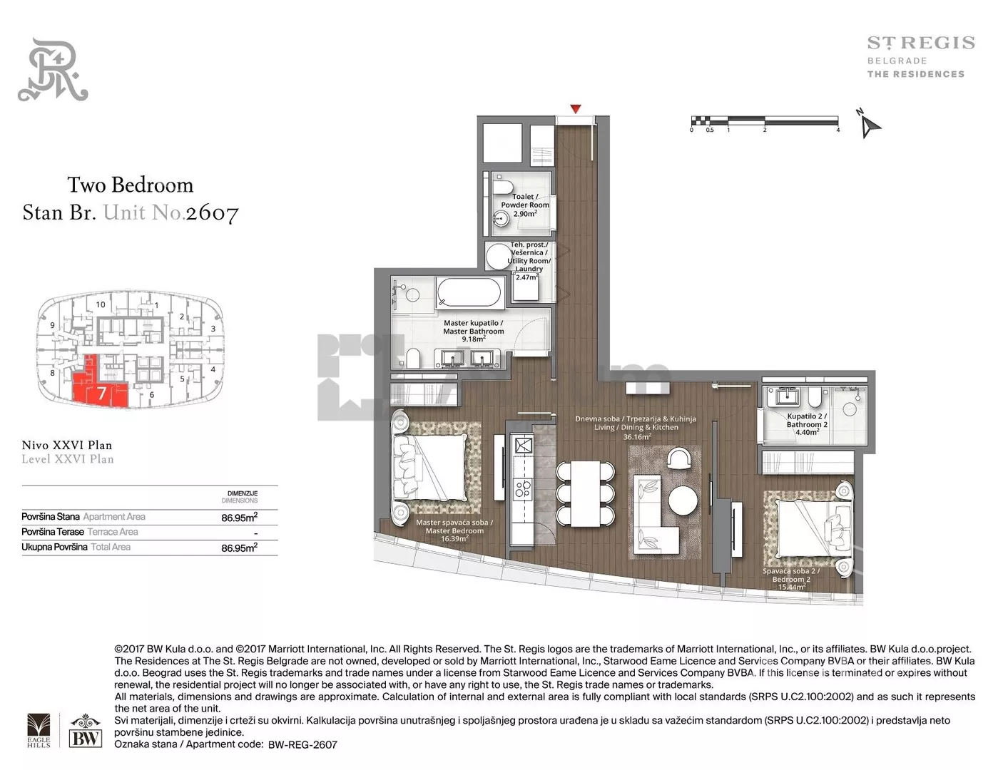 Ova 42-spratna zgrada, najviša i najspektakularnija u Srbiji i regionu, doseže visinu od 168 metara i prostire se na površini od 47.000 kvadratnih metara. Pored luksuznih brendiranih apartmana, zgrada će sadržati i hotel St. Regis Belgrade na prvih jedanaest spratova, sa planiranim kapacitetom od 125 soba i apartmana, s pogledom na grad i reku Savu.