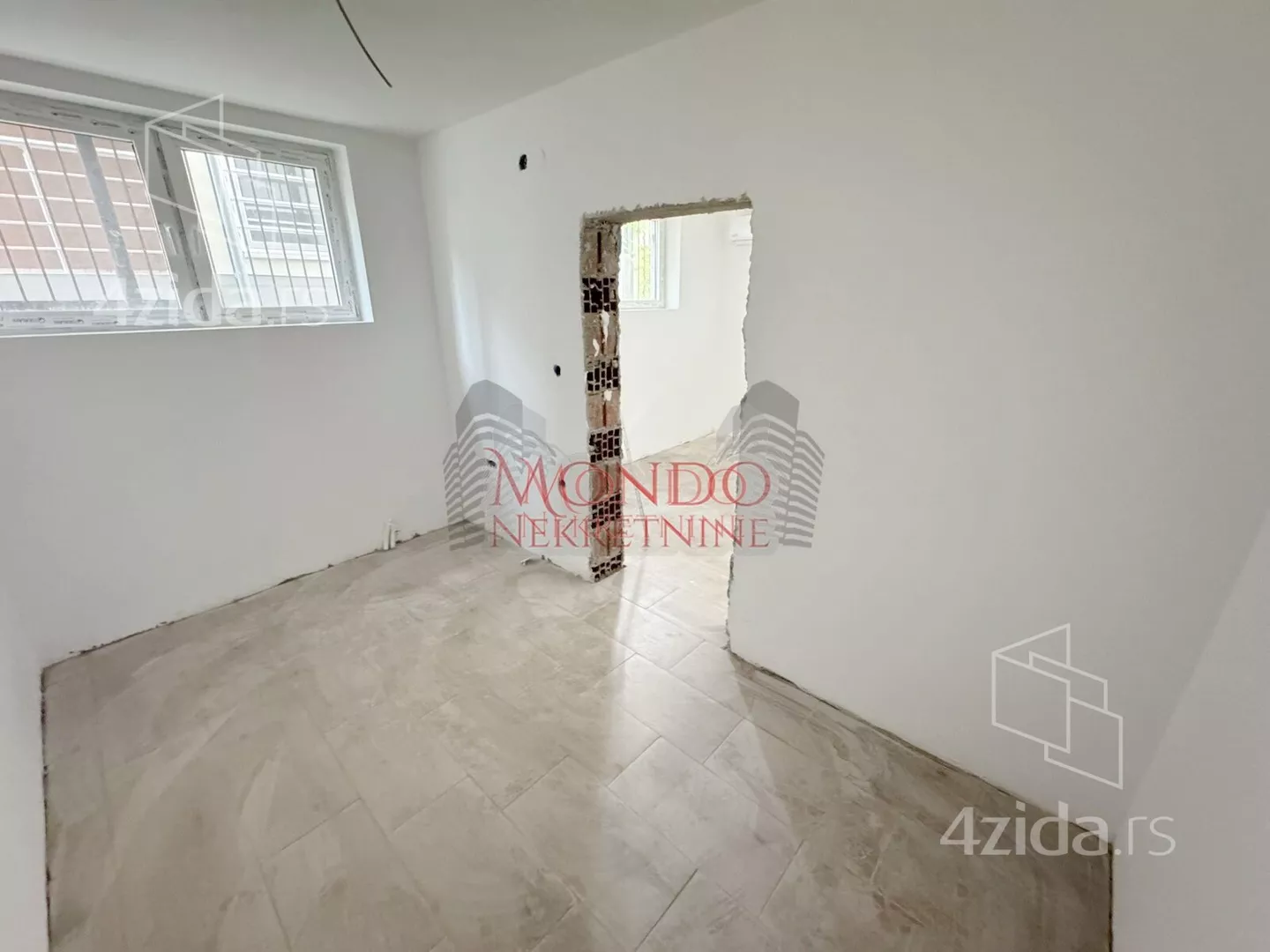 Stan se nalazi u polu suturenu nove stambene zgrade ukupne povrsine od 54m2 sa etaznim grejanjem na struju i klima uredjajem. Sastoji se od dnevnog boravka sa kuhinjom, dve spvace sobe, hodnika i kupatila.