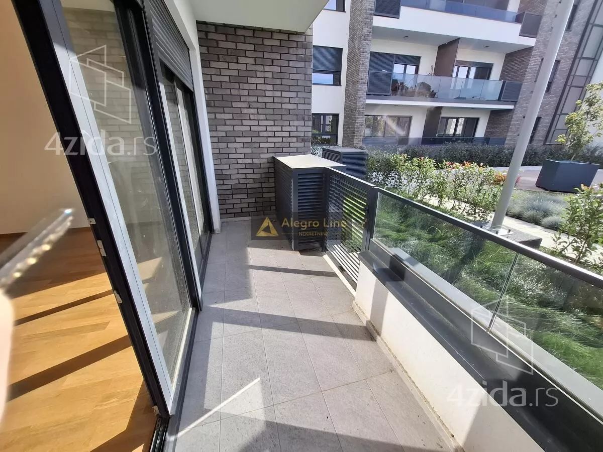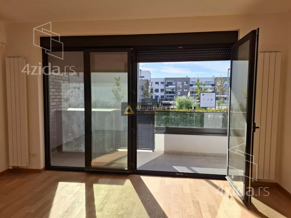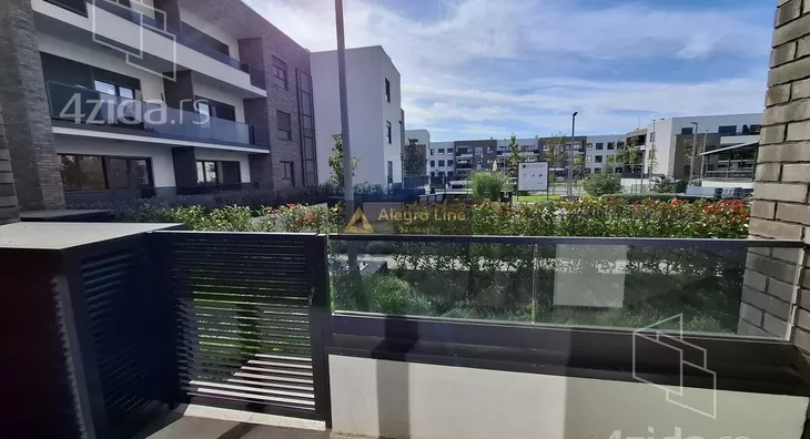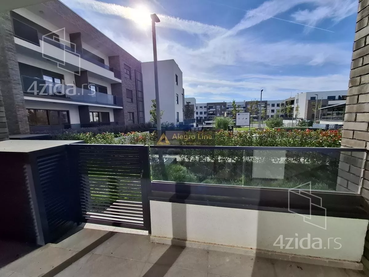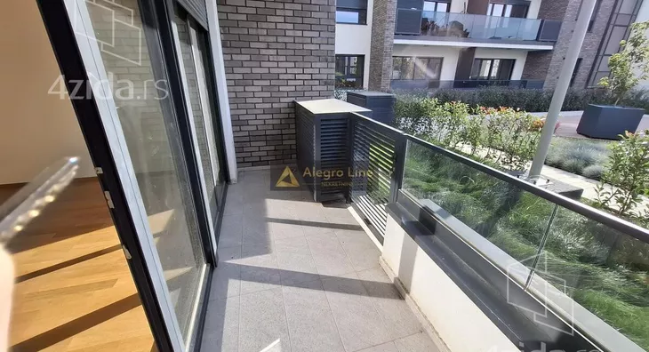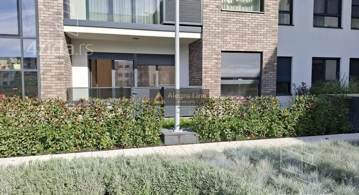 Stan se sastoji od ulaznog hodnika, velike dnevne sobe sa kuhinjom i trpezarijom, dve spavaće sobe, dva kupatila i odvojenog prostora za garderobere . Jedno prostrano kupatilo je opremljeno tuš kabinom, a drugo ležećom kadom. Iz dnevne sobe se preko balkonskih vrata koja se prostiru preko celog zida, izlazi na veliku tersu, a preko nje u baštu koja se proteže celom dužinom stana. Stan je orijentisan dvorišno, a ispred zgrade je lepo uređeno dečje igralište.