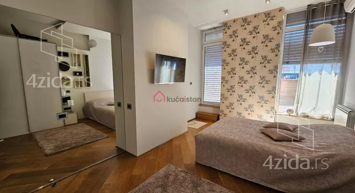 - Opremljenost: Namešteno - internet, interfon, TV, klima, veš mašina, sudo mašina, frižider, rerna, ležaj, plakar, kanalizacija
