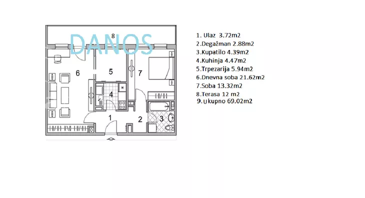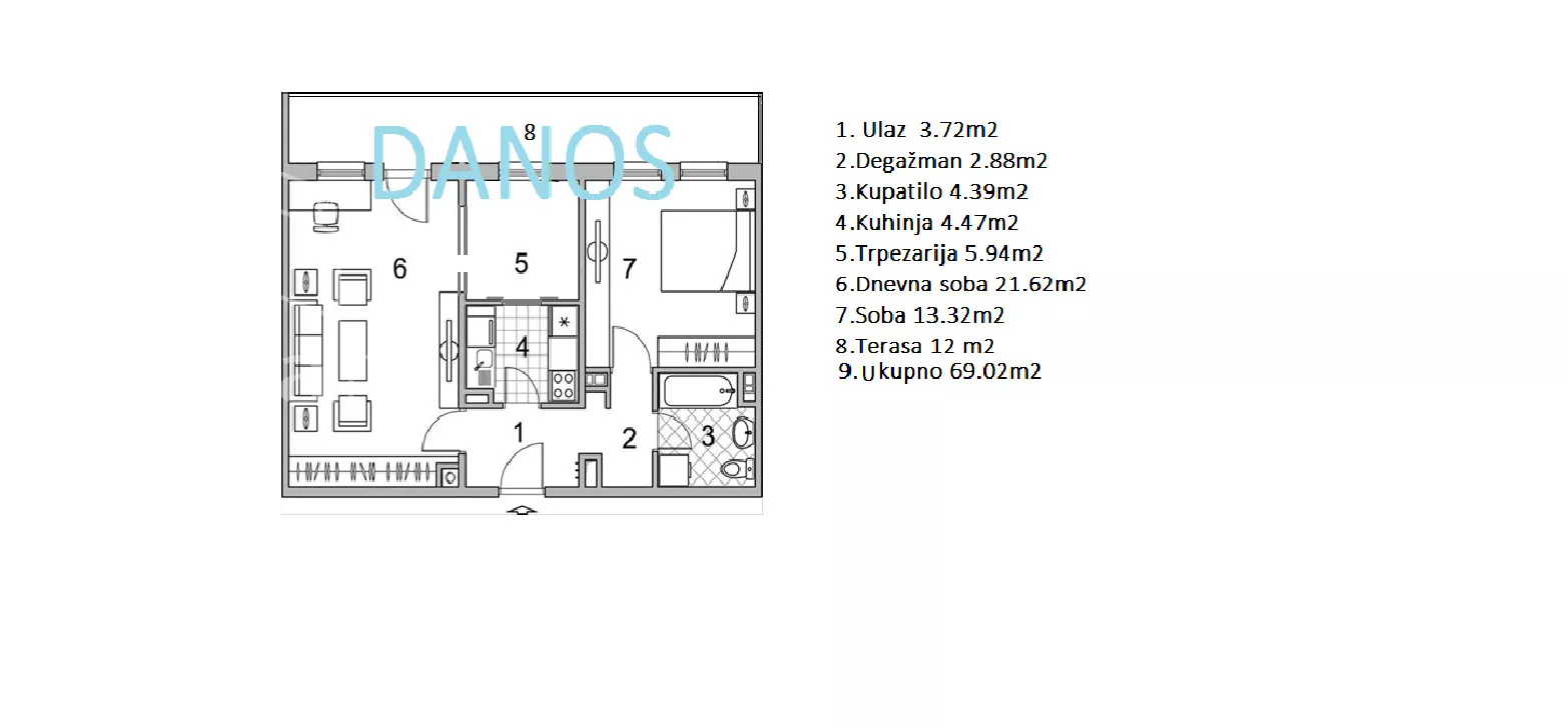 It consists of a large living room that forms an open space with the dining room, a walk-through two-sided kitchen, a larger bedroom, a comfortable bathroom, and a large terrace-loggia.