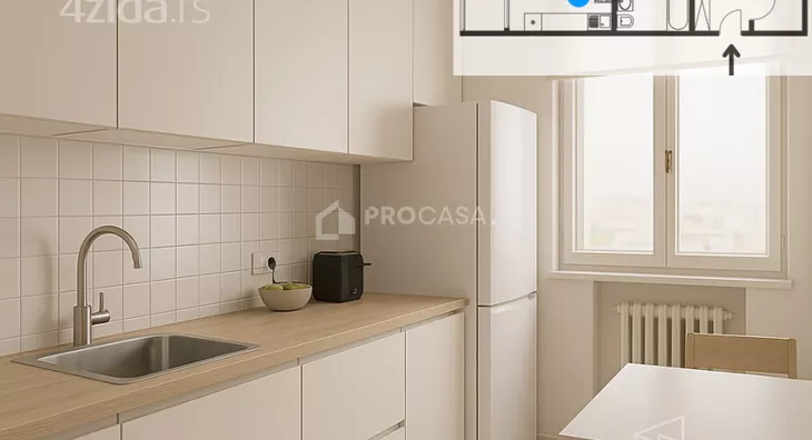 Mapa, nacrt stana i predlog uređenja su informativnog karaktera. Plava tačka na nacrtu predstavlja poziciju kamere.