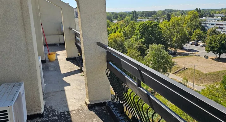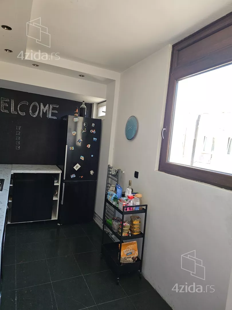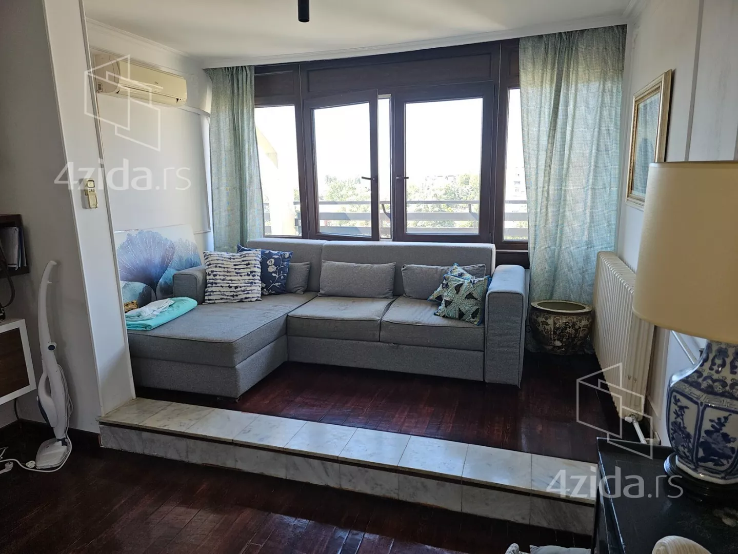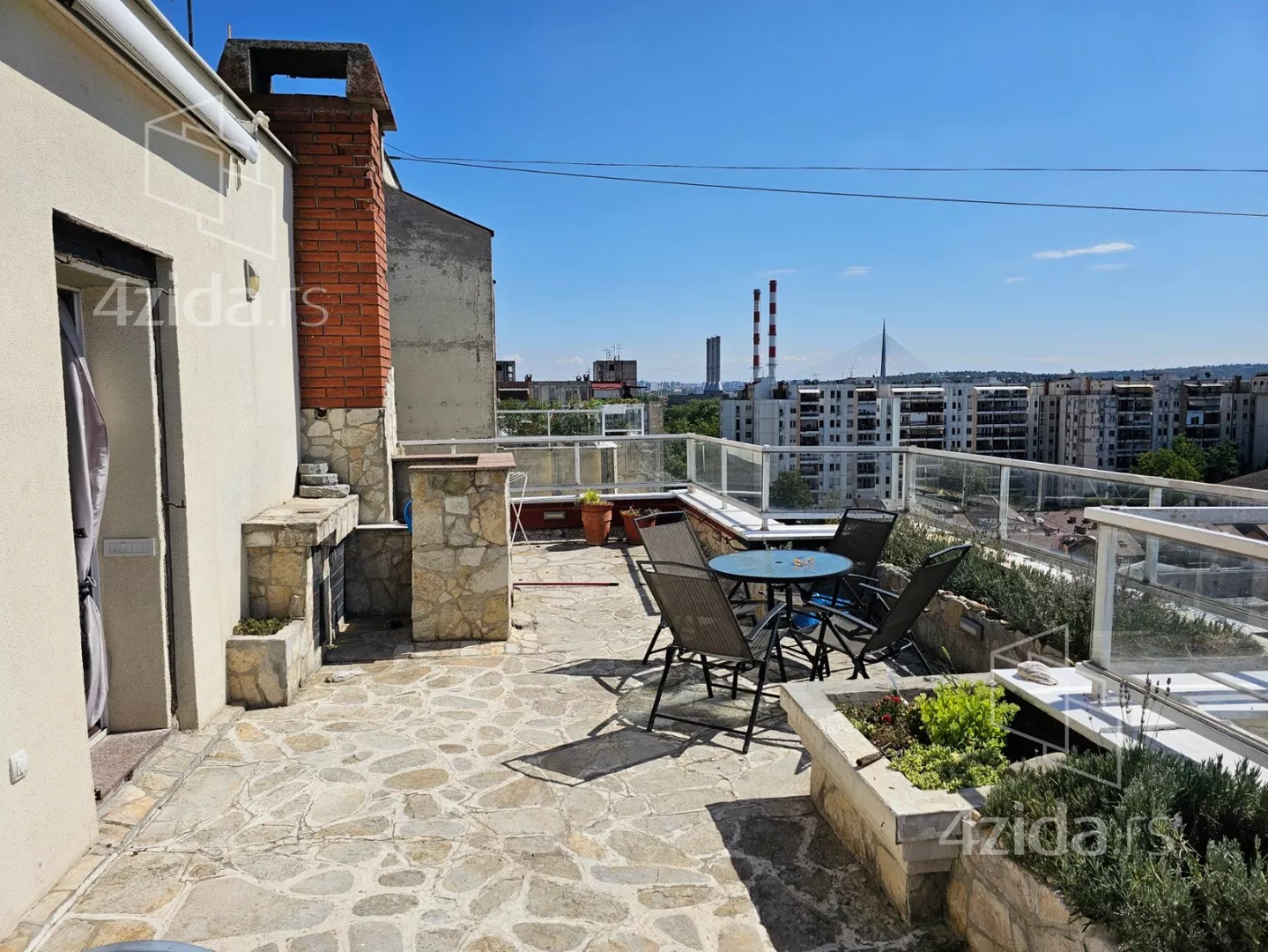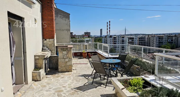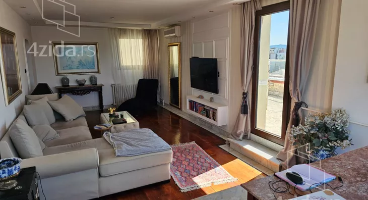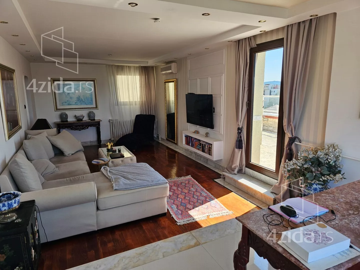 Na prodaju prostran i svetao četvorosoban stan površine 115 m² sa terasom od 40 m², koji se nalazi na osmom (poslednjem) spratu uredne i kvalitetno održavane zgrade sa dva lifta – putničkim i teretnim.