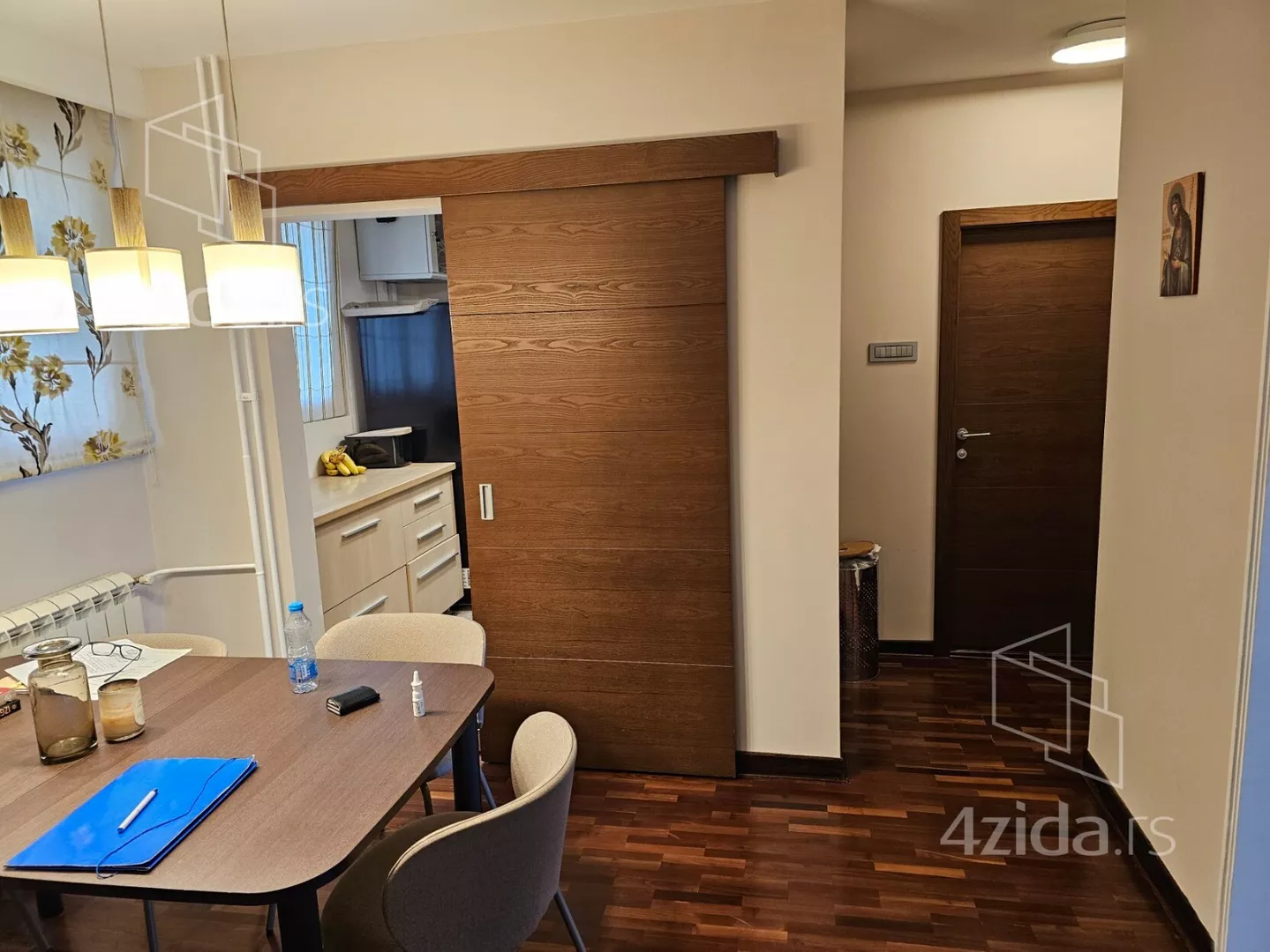 Dobra struktura,funkcionalan raspored.Sastoji se od: ulaznog hodnika,trpezarije,kuhinje,dnevne sobe sa izlaskom na zastakljenu lodju,prolazno predsoblje,kupatilo,spavaca soba.Stan je imao i manju lodju pored kuhinje koja je zastakljena i pridodata kuhinji,kao grejna povrsina.Druga veca lodja je zastakljena i izvedena je struja,tako da se koristi u razne namene.Stan je istocne orijentacije,otvorenog pogleda na zelenilo.
