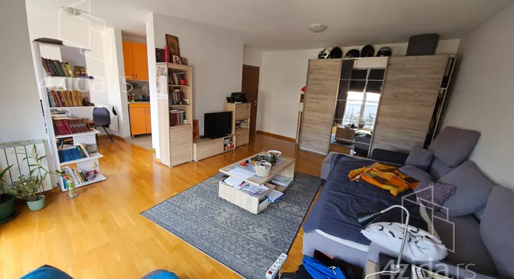 Funkcionalan raspored,lepo iskoriscena kvadratura .Satoji se od: kuhinje,trpezarije,dnevne sobe sa izlaskom na terasu,hodnik iz koga se ide u druge dve sobe,kupatilo.Kupatilo ima prirodnu ventilaciju-prozor.Sve u dobrom stanju,ocuvano.Zgrada novijeg datuma,jedan lift , u podnozju zajednicka garaza sa parking mestima.