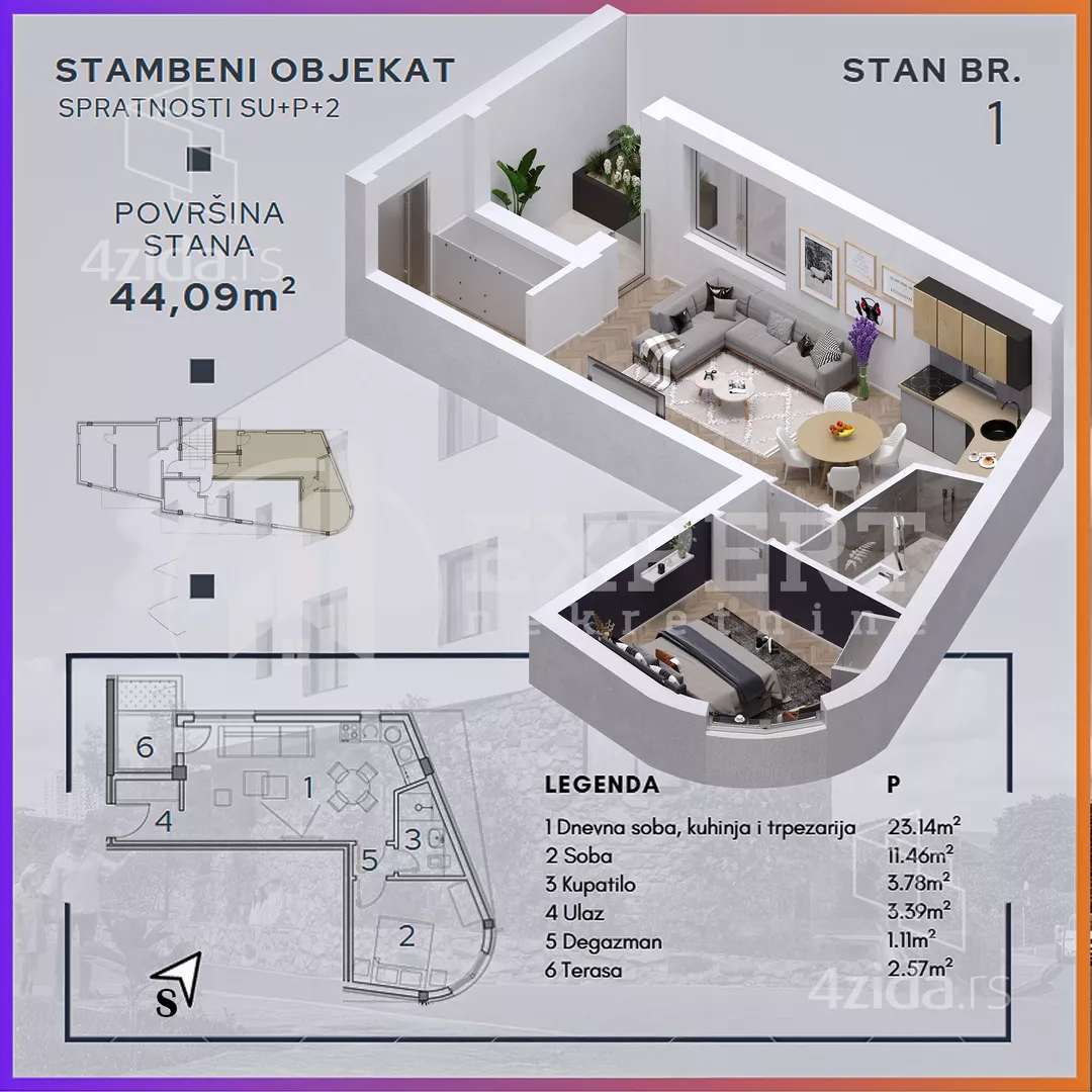 Na prodaju stan u izgradnji na Paliluli, u neposrednoj blizini Hotela „Tami residence“ i kompleksa „Novi Niš”. Stan je projektovane površine 44,09m2, nalazi se u prizemnom delu objekta. Po strukturi je dovosban i sastoji se od ulaznog hodnika, dnevne sobe sa delom za trpezariju i kuhinju, spavaće sobe, kupatila i terase. Gradi se po visokim standardima, demit fasada, energetski pasoš, spoljna PVC (antracit) stolarija, podne obloge od prvoklasne keramike, svaka jedinica dobija kotao na struju i kompletne instalacije za podno grejanje, podrumsku prostoriju, a parking mesto se doplaćuje. Očekivani rok zavšetka radova je sredina 2026-te godine.