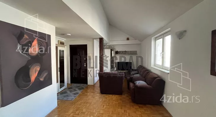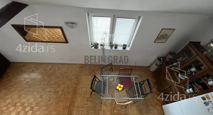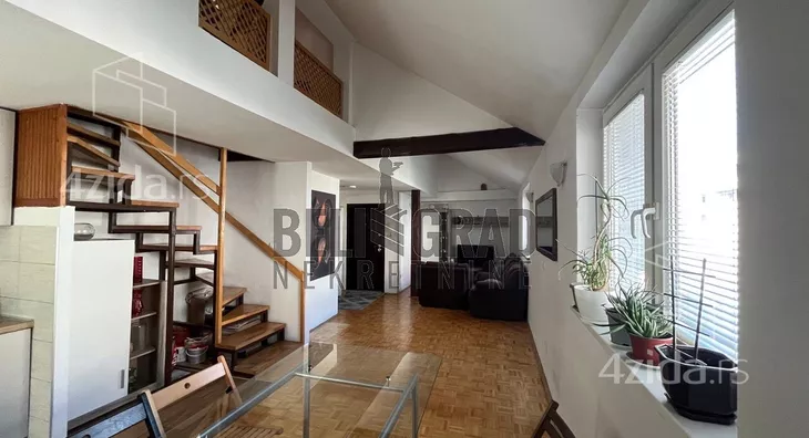 Svetao duplex stan na odličnoj lokaciji. Uknjižen na 58 kvm korisne površine, mereno 74 kvm sa galerijom. Dvostrano orijentisan. Donji deo stana je otvoren prostor od 37kvm. Dnevni boravak, kuhinja, trpezarija i mokri čvor. U gornjem delu stana su dve duple sobe i kupatilo. Stan dizajniran vrlo efikasno, zadržana autentičnost orginalnog prostora. Agencijska provizija 2%.