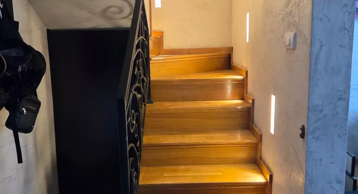 Donji nivo: prostran ulazni hodnik, dnevni boravak, potpuno opremljena kuhinja, toalet i ostava.
