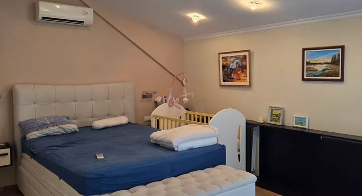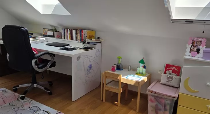 Gornji nivo: tri spavaće sobe (dve sa minimalnim kosinama), kupatilo i terasa sa panoramskim pogledom.