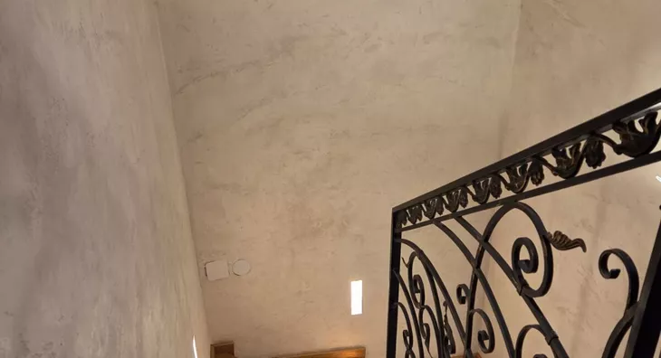 Kožna garnitura i stolice, elegantni gelenderi i ograda na terasi od kovanog gvožđa.