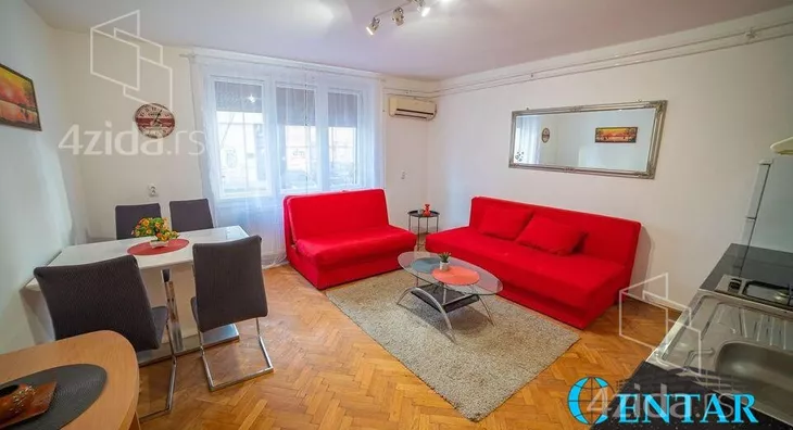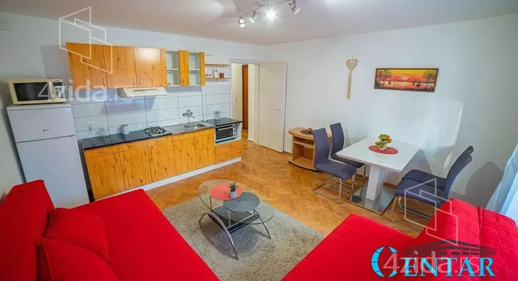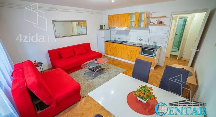 - Opremljenost: Namešteno - TV, klima, kuhinjski elementi, frižider, mikrotalasna rerna, šporet, plakar