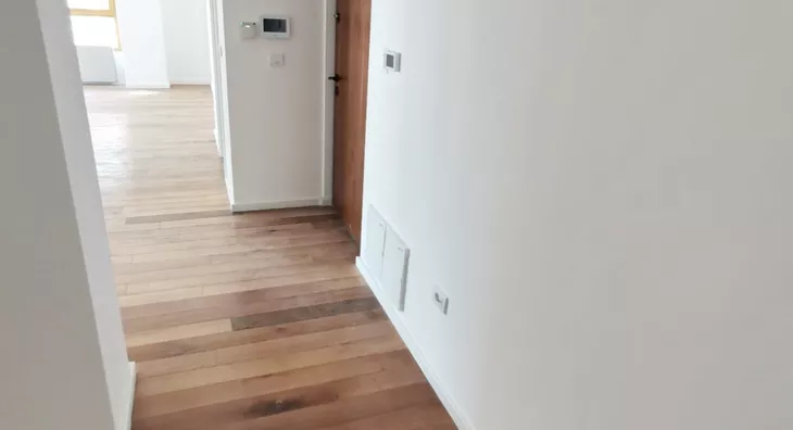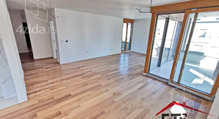Stan cetvorosobne strukture na 6. spratu povrsine 117m2, sastoji se od velikog dnevnog boravavka sa terasom, kuhinjom i trpezarijom i tri spavace sobe sa dva kupatila, odvojen deo za ves masine i jos jednom terase.