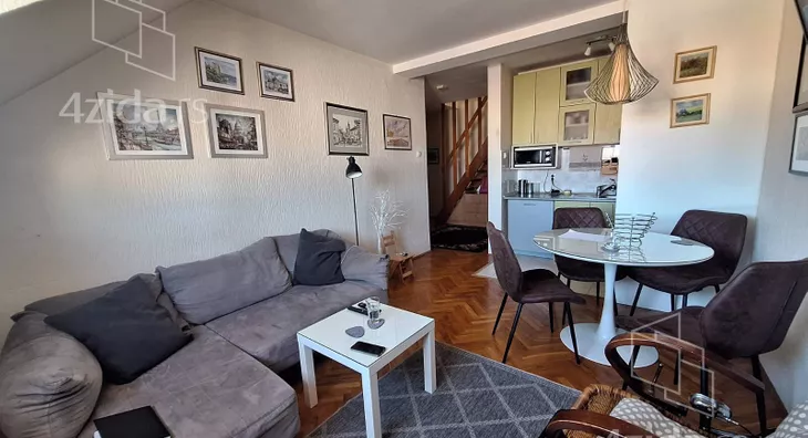 Na donjem spratu nalazi se dnevni boravak sa kuhinjom, spavaća soba, ostava, kupatilo i terasa. Na gornjem se nalaze dve sobe i toalet. Uz stan ide i poseban podrum. Postoji zajednički parking u dvorištu.
