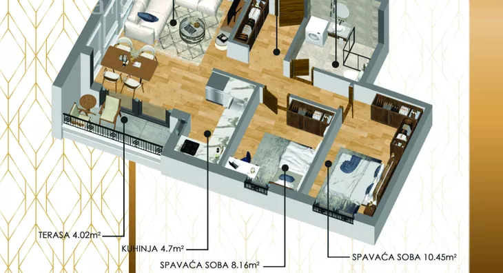 Struktura stana: hodnik, dnevna soba sa trpezarijom i kuhinjom, dve spavaće sobe, kupatilo i terasa.