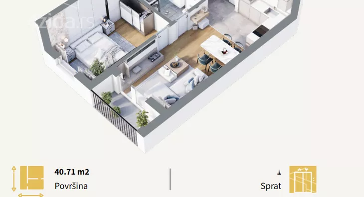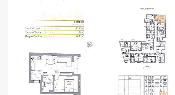 Stan u novogradnji površine 40,71m2 koji se sastoji od dnevnog boravka sa kuhinjom i trpezarijom, kupatla, spavaće sobe i terase.Zgrada je građena od termoblokova najviših izolacijskih svojstava+fasadna izolacija.Pregradni zidovi će biti izgrađeni od opeke. Tarket podne obloge u sobama i trpezariji a u kuhinji I kupatilu I klasa keramike i tuš paravan od kaljenog stakla, linijski slivnik i ugradni vodokotlić. Stan će imati sigurnosna vrata, optički priključak, interfon i instalacije za klimu. Rok završetka poslednji kvarta kvartal 2027.godine.