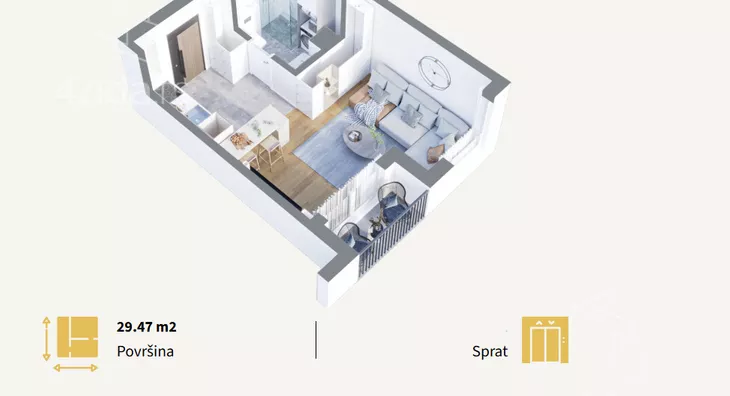 Stan u novogradnji površine 29.47m2 koji se sastoji od dnevnog boravka sa kuhinjom i trpezarijom i kupatila. Stan će imati podno grejanje koje se ističe niskim troškovima grejanja na prirodni gas, kvalitetnu aluminijumsku stolariju sa troslojnim niskoemisionim staklom i PVC roletnom. Zidovi su izgrađeni od termoblokova najviših izolacijskih svojstava + fasadna izolacija.Pregradni zidovi izgrađeni su od opeke. Na podovima će biti tarket podne obloge u sobama i trpezariji, a keramika I klase u kupatilima i kuhinji. U kupatilu tuš paravani od kaljenog stakla i linijski slivnici i ugradni vodokotlići. Stan će imati sigurnosna ulazna vrata,optički priključak,interfon iinstalacije za klimu. Završetak radova kraj 2027. godine.