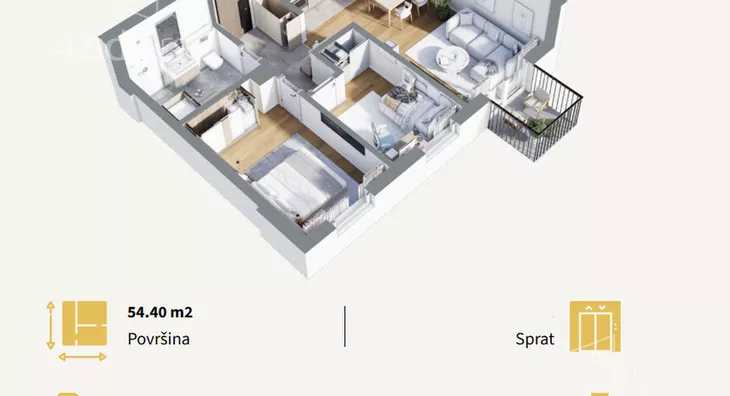 Stan u novogradnji površine 54,40m2 koji se sastoji od dnevnog boravka sa kuhinjom i trpezarijom, dve spavaće sobe,kupatila. Stan će imati podno grejanje koje se ističe niskim troškovima grejanja na prirodni gas, kvalitetnu aluminjumsku stolariju sa troslojnim niskoemisionim staklom i PVC roletnom. Zidovi su izgrađeni od termoblokova najviših izolacijskih svojstava + fasadna izolacija.Pregradni zidovi izgrađeni su od opeke. Na podovima će biti tarket podne obloge u sobama i trpezariji, a keramika I klase u kupatilima i kuhinji. U kupatilu tuš paravani od kaljenog stakla i linijski slivnici i ugradni vodokotlići. Stan će imati sigurnosna ulazna vrata,optički priključak,interfon iinstalacije za klimu. Završetak radova kraj 2027. godine.