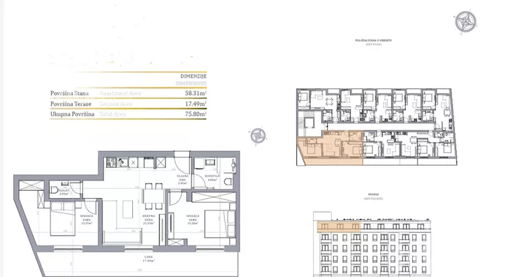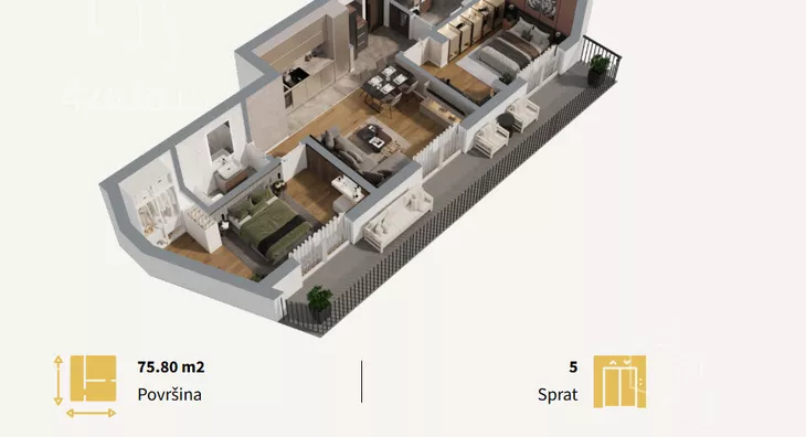 Stan u novogradnji površine 75,80 m2 koji se sastoji od dnevnog boravka sa kuhinjom i trpezarijom, dve spavaće sobe,kupatila i toaleta. Stan će imati podno grejanje koje se ističe niskim troškovima grejanja na prirodni gas, kvalitetnu aluminjumsku stolariju sa troslojnim niskoemisionim staklom i PVC roletnom. Zidovi su izgrađeni od termoblokova najviših izolacijskih svojstava + fasadna izolacija.Pregradni zidovi izgrađeni su od opeke. Na podovima će biti tarket podne obloge u sobama i trpezariji, a keramika I klase u kupatilima i kuhinji. U kupatilu tuš paravani od kaljenog stakla i linijski slivnici i ugradni vodokotlići. Stan će imati sigurnosna ulazna vrata,optički priključak,interfon iinstalacije za klimu. Završetak radova kraj 2027. godine.