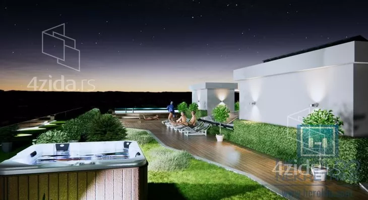 Krovna površina je planirana kao PROHODNA TERSA SA BAZENOM 20m2 KOJI ĆE BITI OKRUŽEN ZELENILOM I LEŽALJKAMA.