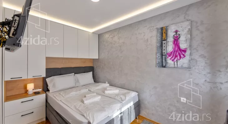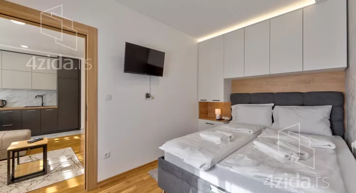 - Opremljenost: Namešteno - internet, TV, klima, veš mašina, kuhinjski elementi, sudo mašina, frižider, šporet, rerna, ležaj, plakar, ugradni plakar