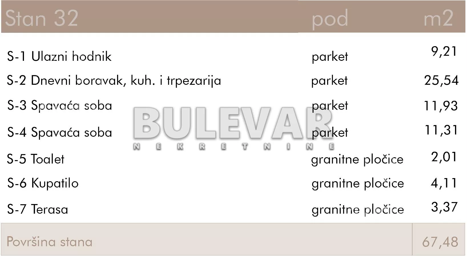 Na prodaju ekskluzivna novogradnja u centru. Stambeno poslovni objekat Po+P+8. Stan je projektovane površine 67,48m2. Nalazi se na osmom spratu, čine ga ulazni hodnik, dnevna soba sa trpezarijom i kuhinjom, dve spavaće sobe, toalet, kupatilo i terasa. Svaka stambena jedinica ima nezavistan sistem grejanja i hlađenja koji je automatizovan i moguće ga je kontrolisati putm mobilnog uređaja. Sistem za grejanje je postavljen kroz pod sa elektro-kotlom, dok je rashladni sistem sa invertor klimama. Svi podovi izvedeni su kao plivajući sa ugrađenom zvučnom izolacijom. Na podu je višelojni parket, a u kupatilu granitna keramika.Unutrašnja stolarija izrađena je od visoko kvalitetnog furnira, dok je spoljna stolarija od aluminijuma. Za kupce prvog stana postoji mogućnost povratka PDV-a. Postoji mogućnost kupovine parking mesta. Ovo je samo deo naše ponude, za više informacija stojimo Vam na raspolaganju.