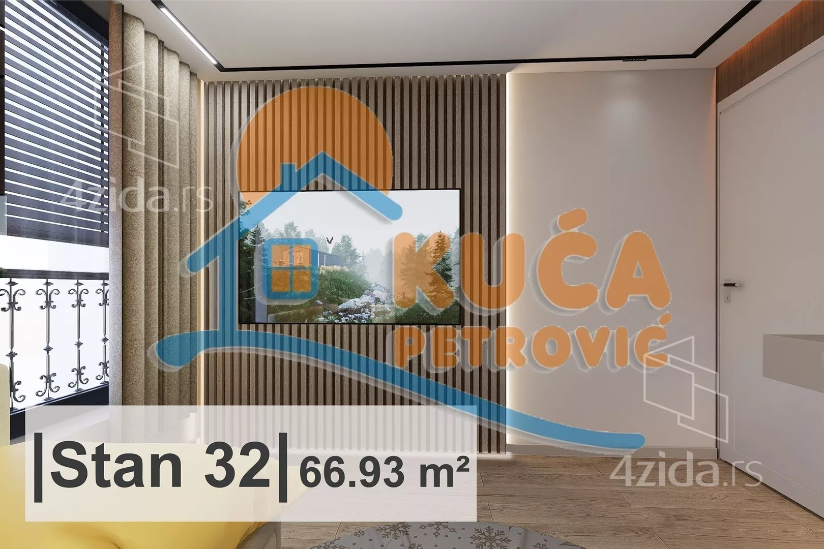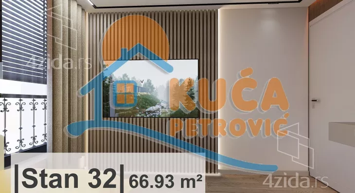 Na prodaju ekskluzivna novogradnja u centru. Stambeno poslovni objekat Po+P+8. Stan je projektovane površine 67,48m2. Nalazi se na osmom spratu, čine ga ulazni hodnik, dnevna soba sa trpezarijom i kuhinjom, dve spavaće sobe, toalet, kupatilo i terasa. Svaka stambena jedinica ima nezavistan sistem grejanja i hlađenja koji je automatizovan i moguće ga je kontrolisati putm mobilnog uređaja. Sistem za grejanje je postavljen kroz pod sa elektro-kotlom, dok je rashladni sistem sa invertor klimama. Svi podovi izvedeni su kao plivajući sa ugrađenom zvučnom izolacijom. Na podu je višelojni parket, a u kupatilu granitna keramika.Unutrašnja stolarija izrađena je od visoko kvalitetnog furnira, dok je spoljna stolarija od aluminijuma. Za kupce prvog stana postoji mogućnost povratka PDV-a. Postoji mogućnost kupovine parking mesta. Ovo je samo deo naše ponude, za više informacija stojimo Vam na raspolaganju.