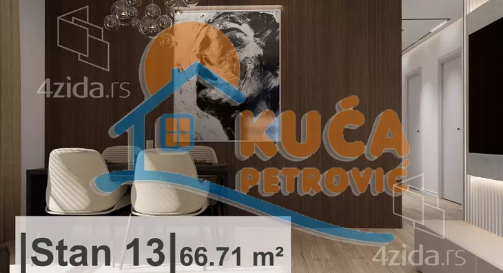 Na prodaju ekskluzivna novogradnja u centru. Stambeno poslovni objekat Po+P+8. Stan je projektovane površine 66,72m2. Nalazi se na trećem spratu, čine ga ulazni hodnik, dnevna soba sa trpezarijom i kuhinjom, dve spavaće sobe, toalet, kupatilo i terasa. Svaka stambena jedinica ima nezavisan sistem grejanja i hlađenja koji je automatizovan i moguće ga je kontrolisati putem mobilnog uređaja. Sistem za grejanje je postavljen kroz pod sa elektro-kotlom, dok je rashladni sistem sa invertor klimama. Svi podovi izvedeni su kao plivajući sa ugrađenom zvučnom izolacijom. Na podu je višeslojni parket, a u kupatilu granitna keramika. Unutrašnja stolarija izrađena je od visoko kvalitetnog furnira, dok je spoljna stolarija od aluminijuma. Za kupce prvog stana postoji mogućnost povratka PDV-a. Postoji mogućnost kupovine parking mesta. Ovo je samo deo naše ponude, za više informacija stojimo Vam na raspolaganju.