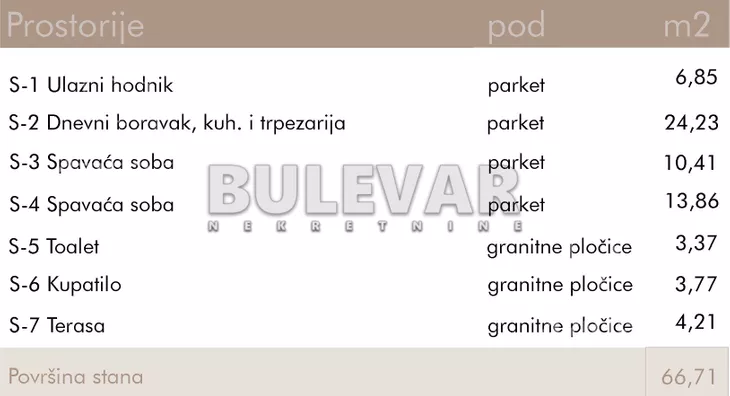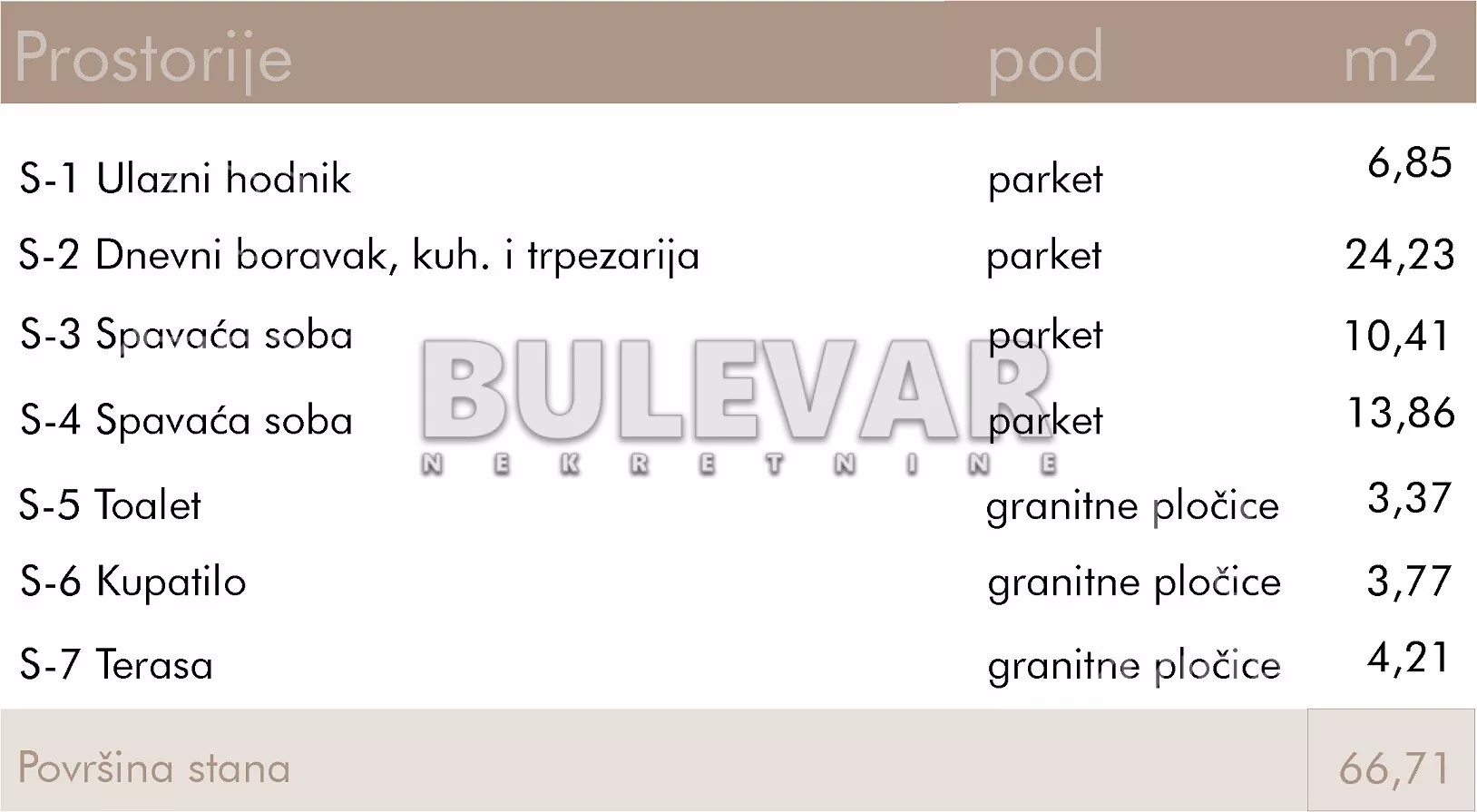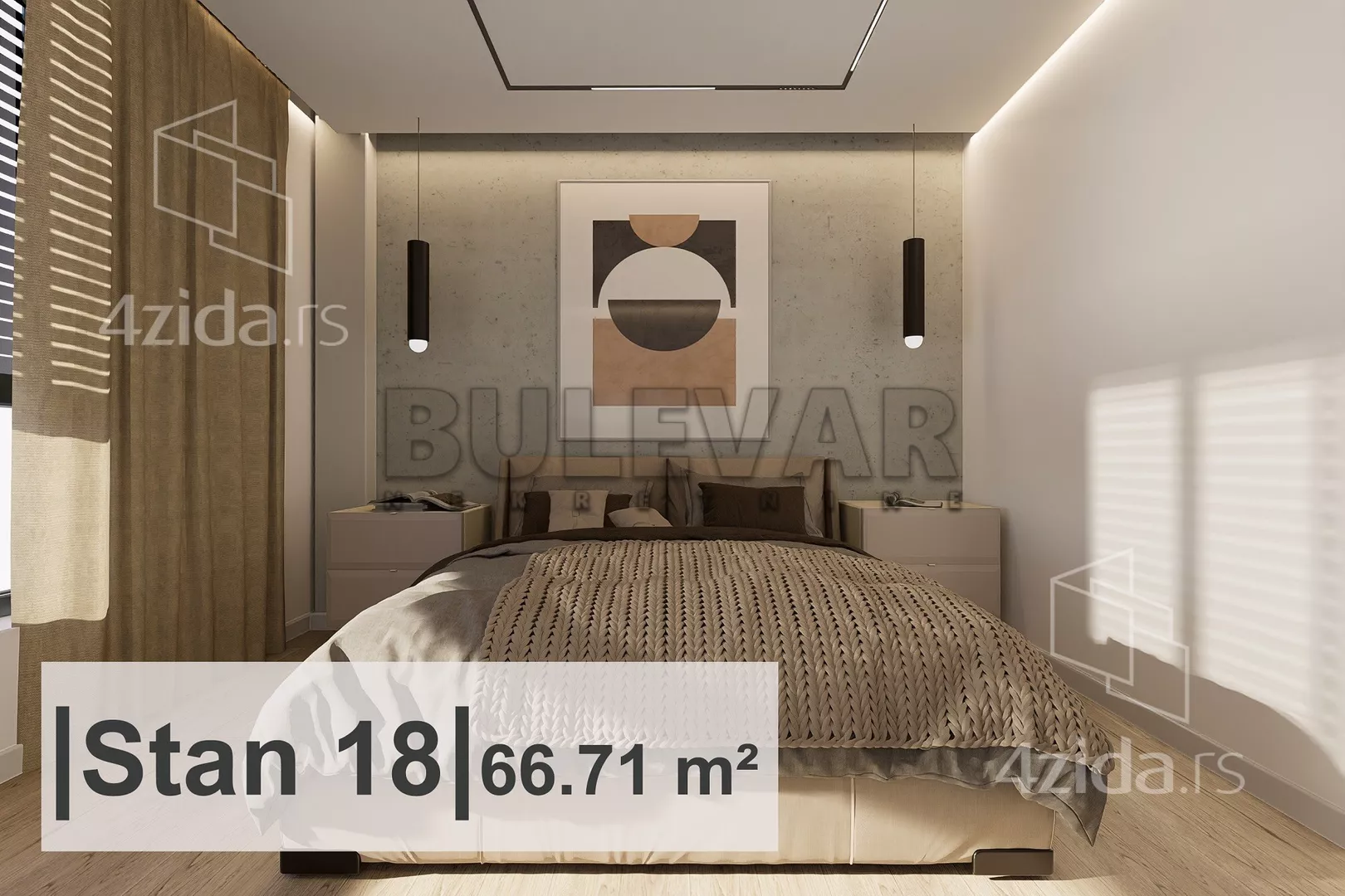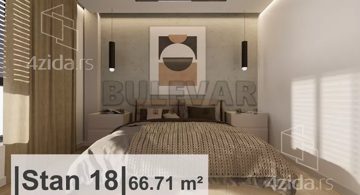 Na prodaju ekskluzivna novogradnja u centru. Stambeno poslovni objekat Po+P+8. Stan je projektovane površine 66,72m2. Nalazi se na četvrtom spratu, čine ga ulazni hodnik, dnevna soba sa trpezarijom i kuhinjom, dve spavaće sobe, toalet, kupatilo i terasa. Svaka stambena jedinica ima nezavisan sistem grejanja i hlađenja koji je automatizovan i moguće ga je kontrolisati putem mobilnog uređaja. Sistem za grejanje je postavljen kroz pod sa elektro-kotlom, dok je rashladni sistem sa invertor klimama. Svi podovi izvedeni su kao plivajući sa ugrađenom zvučnom izolacijom. Na podu je višeslojni parket, a u kupatilu granitna keramika. Unutrašnja stolarija izrađena je od visoko kvalitetnog furnira, dok je spoljna stolarija od aluminijuma. Za kupce prvog stana postoji mogućnost povratka PDV-a. Postoji mogućnost kupovine parking mesta. Ovo je samo deo naše ponude, za više informacija stojimo Vam na raspolaganju.