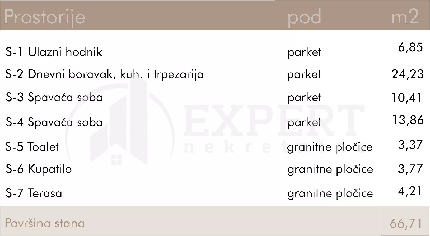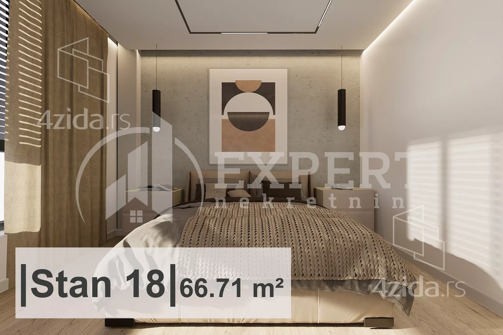 Na prodaju ekskluzivna novogradnja u centru. Stambeno poslovni objekat Po+P+8. Stan je projektovane površine 66,72m2. Nalazi se na četvrtom spratu, čine ga ulazni hodnik, dnevna soba sa trpezarijom i kuhinjom, dve spavaće sobe, toalet, kupatilo i terasa. Svaka stambena jedinica ima nezavisan sistem grejanja i hlađenja koji je automatizovan i moguće ga je kontrolisati putem mobilnog uređaja. Sistem za grejanje je postavljen kroz pod sa elektro-kotlom, dok je rashladni sistem sa invertor klimama. Svi podovi izvedeni su kao plivajući sa ugrađenom zvučnom izolacijom. Na podu je višeslojni parket, a u kupatilu granitna keramika. Unutrašnja stolarija izrađena je od visoko kvalitetnog furnira, dok je spoljna stolarija od aluminijuma. Za kupce prvog stana postoji mogućnost povratka PDV-a. Postoji mogućnost kupovine parking mesta. Ovo je samo deo naše ponude, za više informacija stojimo Vam na raspolaganju.