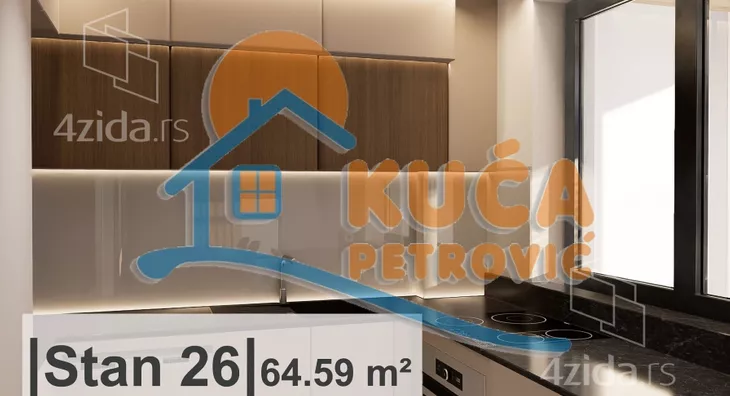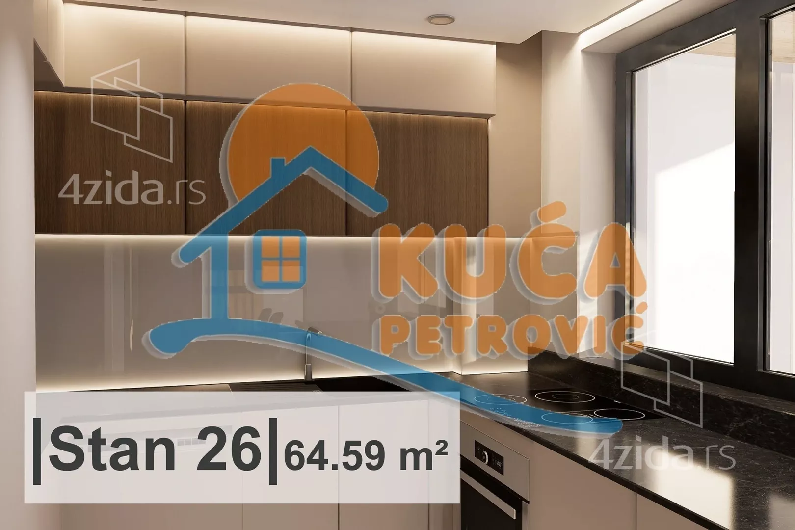 Na prodaju ekskluzivna novogradnja u centru. Stambeno poslovni objekat Po+P+8. Stan je projektovane površine 64,59m2. Nalazi se na šestom spratu, čine ga ulazni hodnik, dnevna soba sa trpezarijom i kuhinjom, dve spavaće sobe, toalet, kupatilo i terasa. Svaka stambena jedinica ima nezavisan sistem grejanja i hlađenja koji je automatizovan i moguće ga je kontrolisati putm mobilnog uređaja. Sistem za grejanje je postavljen kroz pod sa elektro-kotlom, dok je rashladni sistem sa invertor klimama. Svi podovi izvedeni su kao plivajući sa ugrađenom zvučnom izolacijom. Na podu je višelojni parket, a u kupatilu granitna keramika.Unutrašnja stolarija izrađena je od visoko kvalitetnog furnira, dok je spoljna stolarija je od aluminijuma. Za kupce prvog stana postoji mogućnost povratka PDV-a. Postoji mogućnost kupovine parking mesta. Ovo je samo deo naše ponude, za više informacija stojimo Vam na raspolaganju.