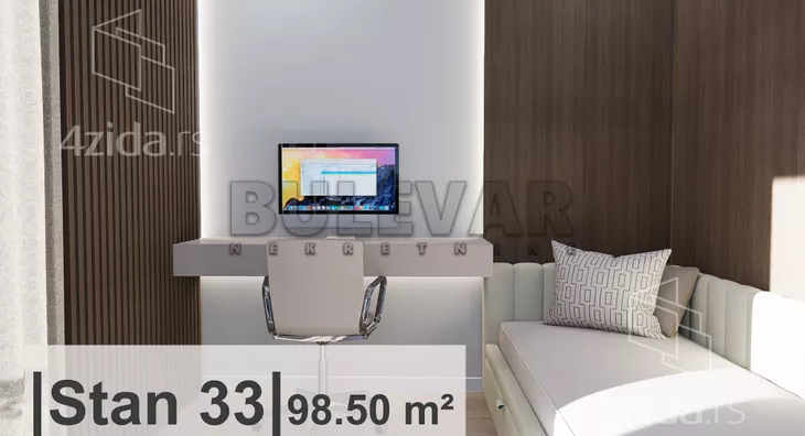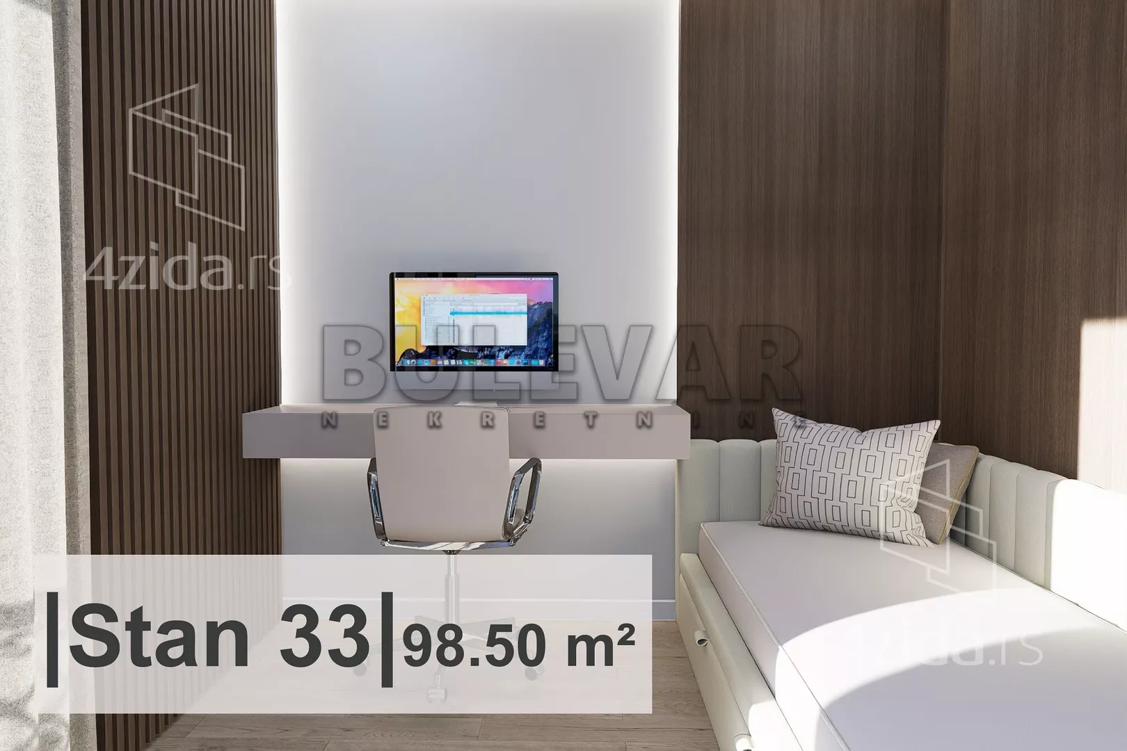 Na prodaju ekskluzivna novogradnja u centru. Stambeno poslovni objekat Po+P+8. Stan je projektovane površine 98,50m2. Nalazi se na osmom spratu, čine ga ulazni hodnik, dnevna soba sa trpezarijom i kuhinjom, tri spavaće sobe, dva toaleta, kupatilo i dve terase. Svaka stambena jedinica ima nezavistan sistem grejanja i hlađenja koji je automatizovan i moguće ga je kontrolisati putm mobilnog uređaja. Sistem za grejanje je postavljen kroz pod sa elektro-kotlom, dok je rashladni sistem sa invertor klimama. Svi podovi izvedeni su kao plivajući sa ugrađenom zvučnom izolacijom. Na podu je višelojni parket, a u kupatilu granitna keramika. Unutrašnja stolarija izrađena je od visoko kvalitetnog furnira, dok je spoljna stolarija od aluminijuma. Za kupce prvog stana postoji mogućnost povratka PDV-a. Postoji mogućnost kupovine parking mesta. Ovo je samo deo naše ponude, za više informacija stojimo Vam na raspolaganju.