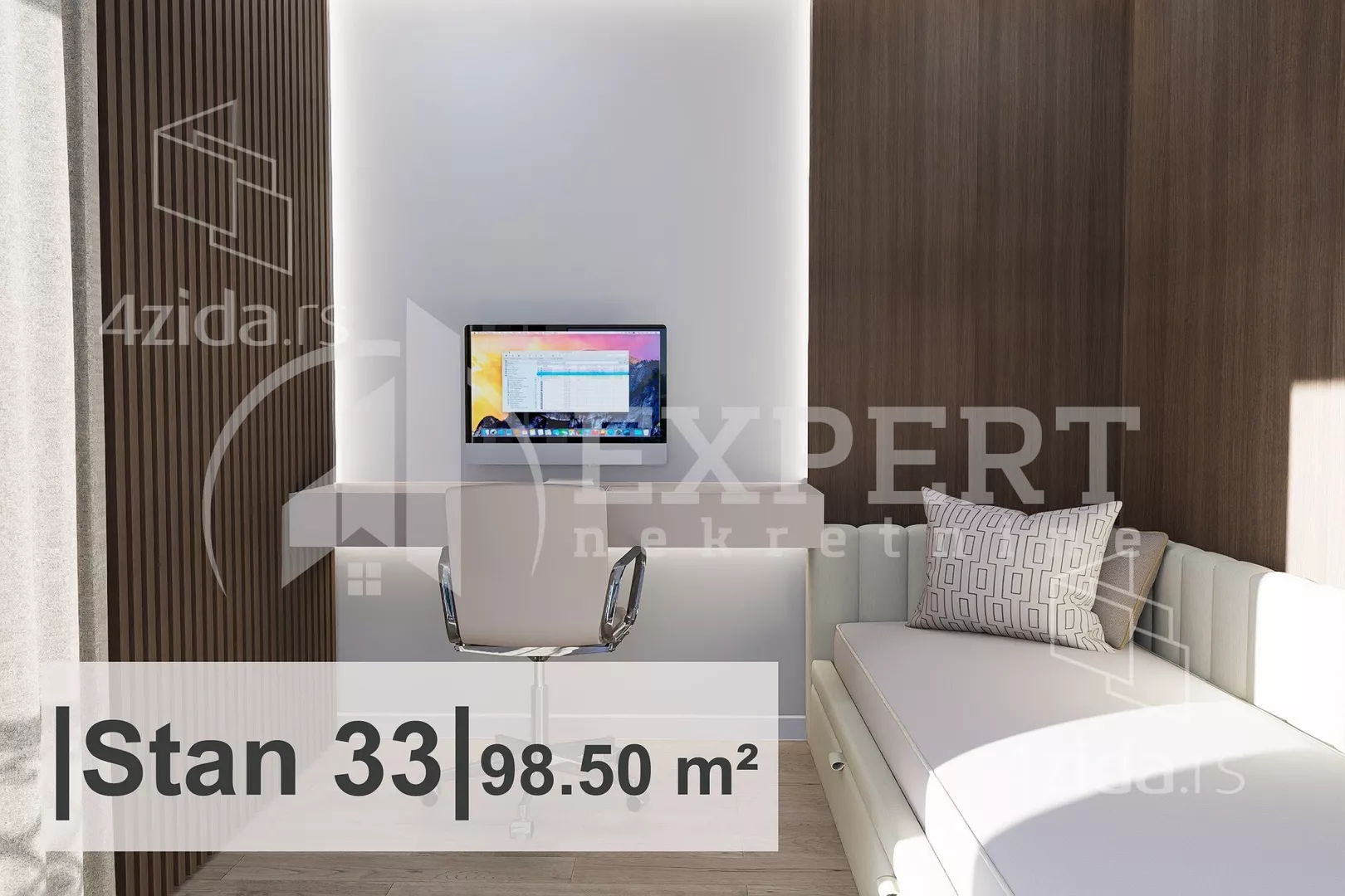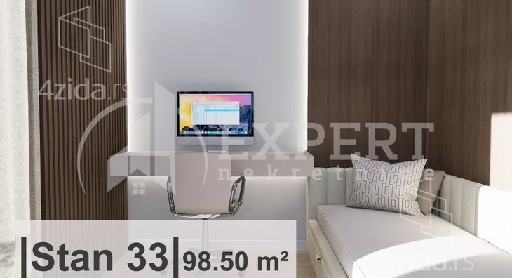 Na prodaju ekskluzivna novogradnja u centru. Stambeno poslovni objekat Po+P+8. Stan je projektovane površine 98,50m2. Nalazi se na osmom spratu, čine ga ulazni hodnik, dnevna soba sa trpezarijom i kuhinjom, tri spavaće sobe, dva toaleta, kupatilo i dve terase. Svaka stambena jedinica ima nezavistan sistem grejanja i hlađenja koji je automatizovan i moguće ga je kontrolisati putm mobilnog uređaja. Sistem za grejanje je postavljen kroz pod sa elektro-kotlom, dok je rashladni sistem sa invertor klimama. Svi podovi izvedeni su kao plivajući sa ugrađenom zvučnom izolacijom. Na podu je višelojni parket, a u kupatilu granitna keramika. Unutrašnja stolarija izrađena je od visoko kvalitetnog furnira, dok je spoljna stolarija od aluminijuma. Za kupce prvog stana postoji mogućnost povratka PDV-a. Postoji mogućnost kupovine parking mesta. Ovo je samo deo naše ponude, za više informacija stojimo Vam na raspolaganju.
