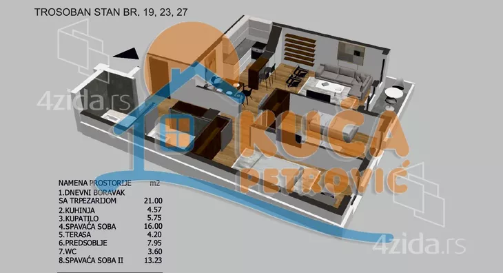 Na prodaju trosoban stan, novogradnja, u stambenom objektu PO,PR,VI, na odličnoj lokaciji na Crvenom pevcu. Zbog svoje pozicije je odlična investicija kako za život, tako i za izdavanje. Stan je komforan sa izuzetnim rasporedom prostorija, projektovane površine 80.46m2. Sastoji se od ulaznog hodnika, dnevne sobe sa kuhinjom i trpezarije, dve spavaće sobe , kupatila, wc-a i terase. Zgrada ispunjava sve najnovije standarde izgradnje. Stolarija je aluminijum,drvo, grejanje etažno sa sopstvenim električnim kotlom u svakoj stambenoj jedinici. Sigurnosna protivpožarna ulazna vrata, kupatilo i kuhinja sa prvoklasnom podnom i zidnom keramikom . Kvalitetan hrastov parket I klase u svim prostorijama. Sa povraćajem PDV-a za kupce koji ostvaruju pravo na oslobodjenje. Ovo je samo deo naše ponude, ovaj kao i druge stanove sa većim brojem fotografija možete pogledati na našem sajtu.