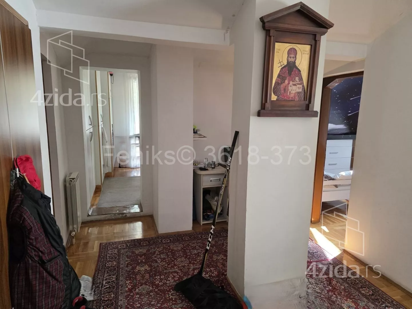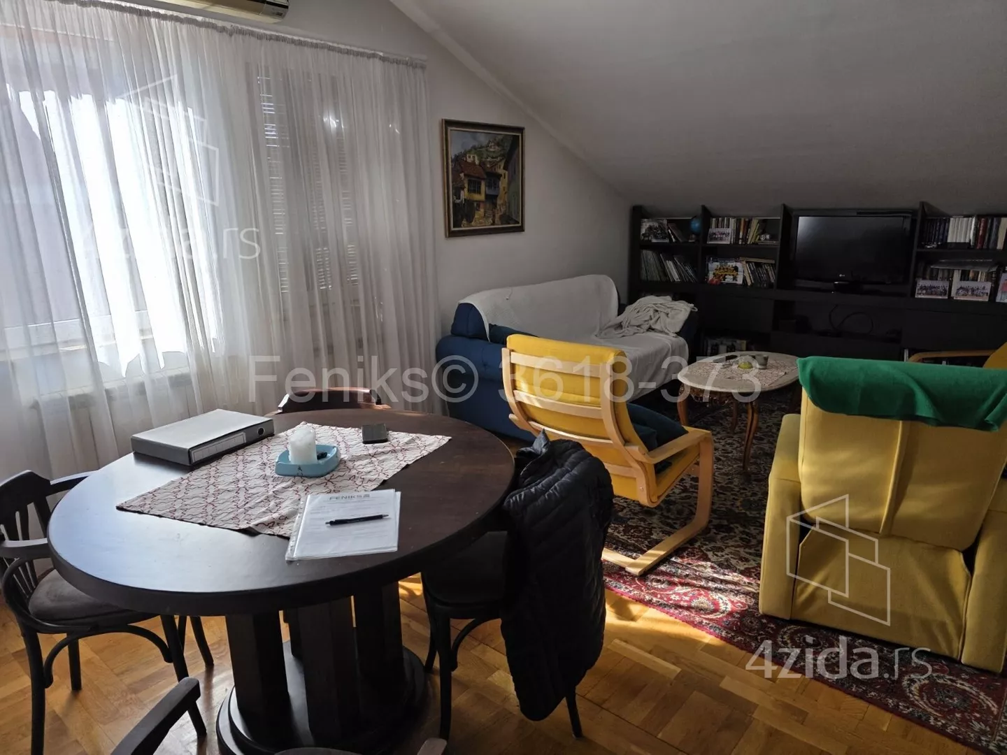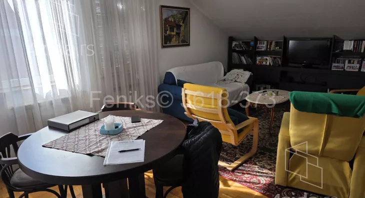 Neobično interesantan stan u potkrovlju. Ima 3 spavaće sobe od kojih su manje dve sa kosinama i krovnim prozorima a jedna veća je bez kosina i sa normalnim prozorima. Dnevni boravak, trpezarija i kuhinja imaju i jedan normalan prozor i jedan krovni. Stan je sa dobrim raspredom, vrlo topao i svetao. Stan podno ima 79m2 a uknjižen je na 33m2, zbog kosina. Zgrada nema lift. Postoji mogućnost kupovine garažnog mesta.
