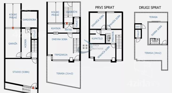 Od prostorija: Nisko prizemlje - garaža, hodnik, toalet, garderoba i soba (studio); Visoko prizemlje - antre, kuhinja, toalet, dnevna soba sa trepezarijom i terasa; Prvi sprat - tri spavaće sobe i kupatilo; Drugi sprat - radna soba, terasa, toalet i ostava.