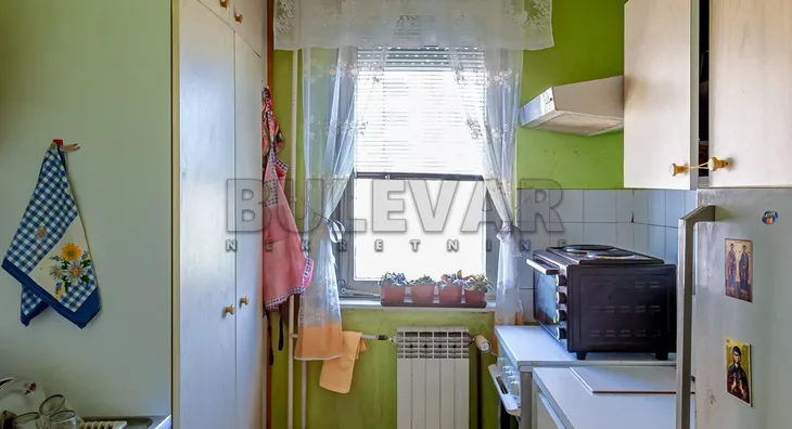 Na prodaju komforan, osvetljen i očuvan stan na IX spratu (od X) kvalitetne zgrade od armiranog betona sa dva lifta. Atraktivna lokacija i orijentacija stana (zapad), koji je u izvornom ali očuvanom stanju i prodaje se sa kompletnim nameštajem i tehnikom ( tri klima uređaja). Sastoji se od ulaznog hodnika, prostrane dnevne sobe sa izlaskom na lođu, izdvojene trpezarije, izdvojene kuhinje i ostave (manja lođa). U spavaćem degažmanu su dve spavaće sobe ( iz jedne se izlazi na lođu), kupatilo i toalet. U hodniku i spavaćim sobama ima puno ugradnih plakara. Na podovima je parket, stolarija drvena, očuvana, a odjavljeno je centralno grejanje i svi radijatori povezani na sopstveni el.kotao. Stan ima pripadajući podrum i slobodan parking u dvorištu zgrade. Odlična investicija. Uknjižena privatna svojina koju je moguće kupiti stambenim kreditom. Za više informacija pozovite agenciju.