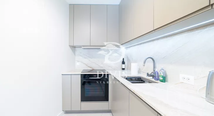 Prodaje se potpuno opremljen. Korišćeni su materijali vrhunskog kvaliteta, a stan je kompletno namešten i opremljen modernim dizajnom.