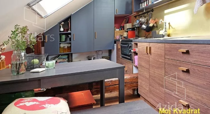 Donji nivo: dnevna soba sa kuhinjom i trpezarijom, spavaća soba na galeriji i kupatilo;
