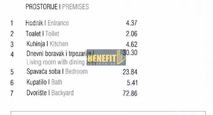 Stan se sastoji od ulaznog hodnika, dnevnog boravka sa trpezarijom, kuhinje, spavaće sobe, kupatila, toaleta (grejna površina 70m2) i velikog dvorišta od 97m2.