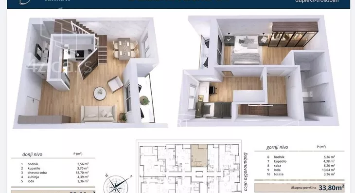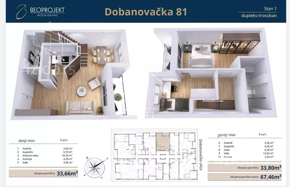Moderan objekat u mirnom delu Zemuna nadomak svih neophodnih sadržaja. Stan je opremljen smart sistemom sa daljinskom kontrolom svih uređaja. Stolarija je aluminijumska sa dvoslojnim staklom, roletne na elektro pogon, grejanje je podno, višeslojni Tarkett, italijanska keramika 1. klase, izolacija kamena vuna 10cm. Donji nivo se sastoji od dnevne sobe sa trpezarijom, kuhinje, kupatila, spavaće sobe i lođe. Na drugom nivou nalaze se dve spavaće sobe, kupatilo i lođa. Merena kvadratura stana je 67m2. Mogućnost kupovine garažnog ili parking mesta. Uredna dokumentacija, rok završetka radova jul 2026. Cene su iskazane sa uračunatim PDV-om. Bez provizije za kupce! Agent: Darko Slivar br. licence 4162 "Art nekretnine" d.o.o. Beograd. Reg. br.339 011... (prikaži broj telefona) .