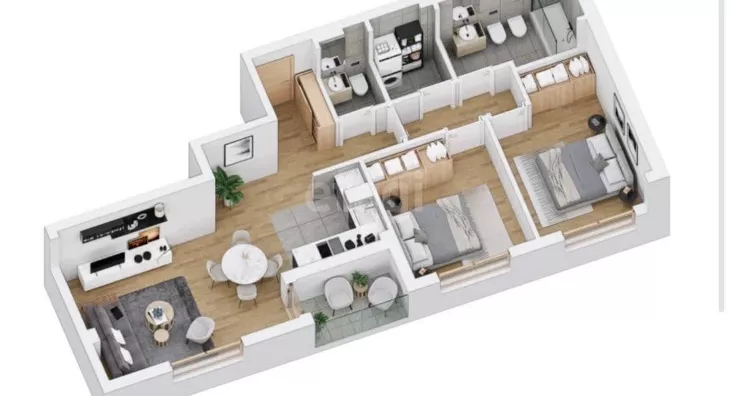 Две спальни,Гостиная с кухней и столовой зоной, Ванная комната, Отдельный туалет с постирочной