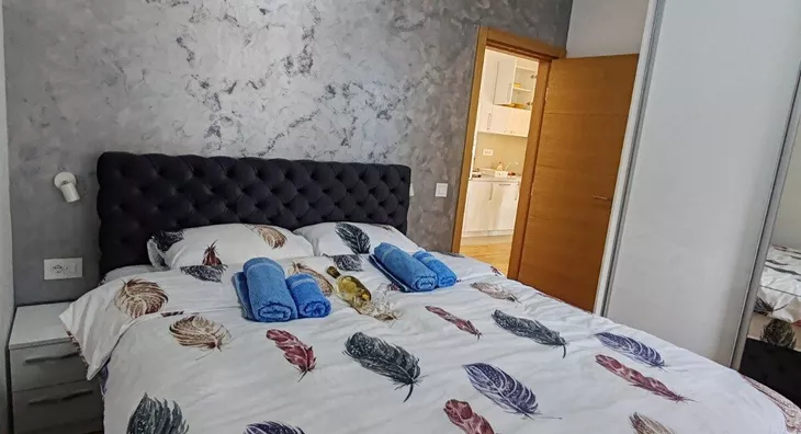 Jednosoban stan se sastoji od dnevne sobe sa kuhinjom i trpezarijom, spavaćom sobom, kupatilom i velikom terasom.