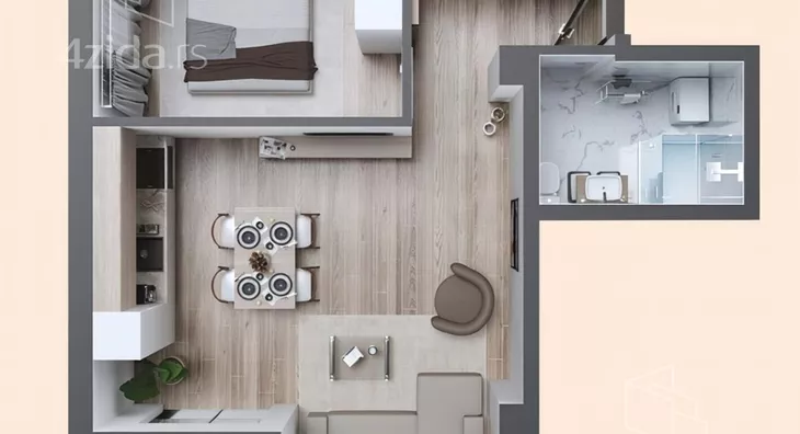 Prostrana dnevna soba sa kuhinjom i trpezarijom, fizički odvojena spavaća soba