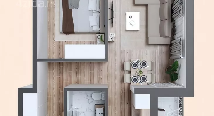 Prostrana dnevna soba sa kuhinjom i trpezarijom, fizički odvojena spavaća soba